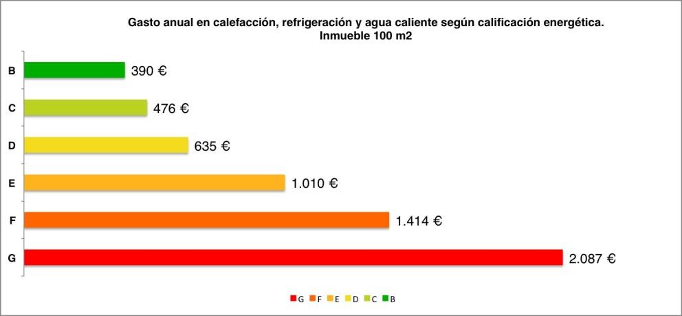 El certificado energético de nuestro inmueble marcará, mediante una letra, el nivel de emisiones de kg CO2/m2 del mismo. Esa calificación oscila entre la A y la G y cada calificación representa unos valores de emisiones concretos y, sobre todo, un gasto energético en euros.